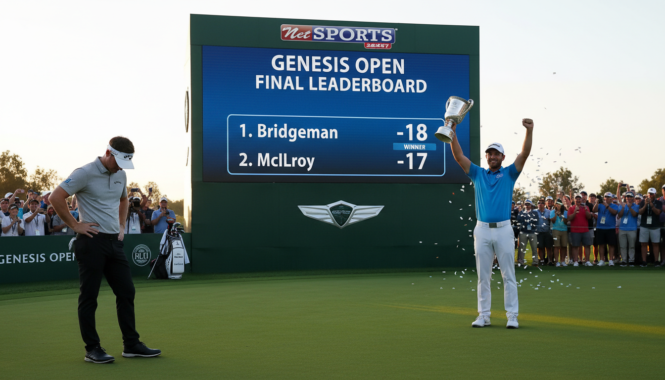 Jacob Bridgeman secured a dramatic and emotional victory at the Genesis Invitational in Los Angeles, holding off a strong late charge from Rory McIlroy to claim his first PGA Tour title. The American golfer finished the tournament at 18 under par, narrowly edging out McIlroy and Kurt Kitayama, who both ended the event tied for second place on 17 under. Despite shooting a composed four-under-par 67 in the final round, McIlroy was unable to completely erase the six-shot deficit he faced at the start of the day.